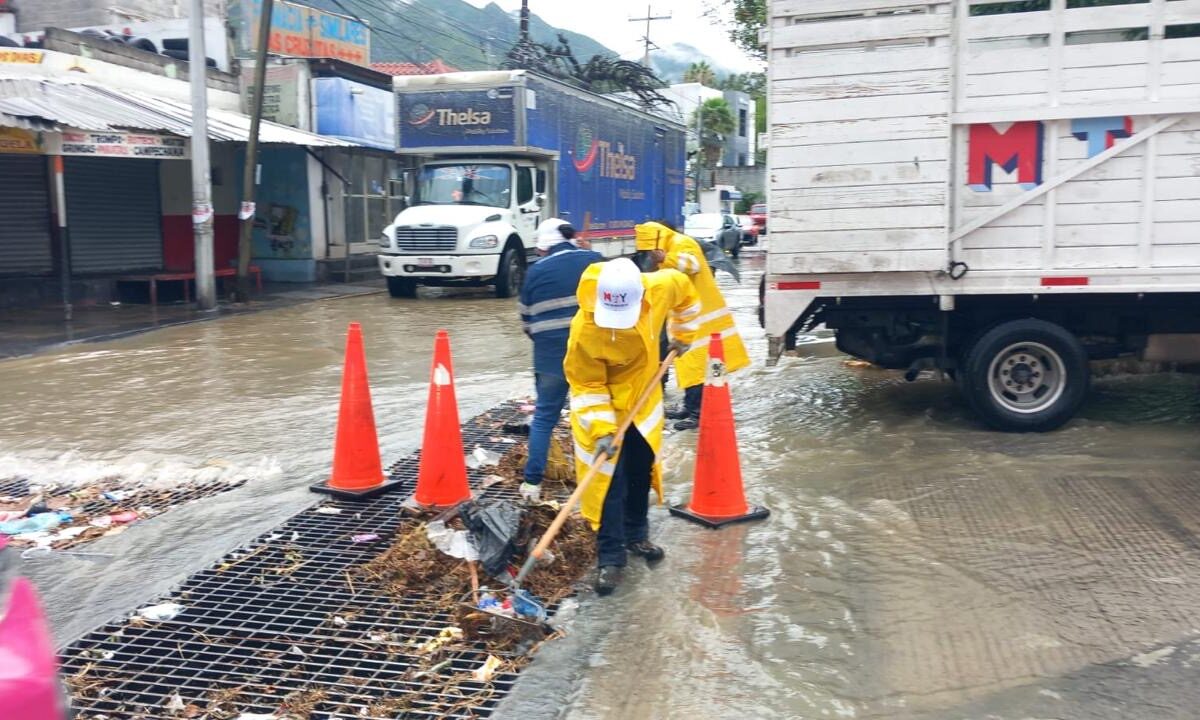 Elementos de las cinco zonas operativas de la Secretaría de Servicios Públicos de Monterrey trabajan en toda la ciudad, especialmente en los sectores con más riesgo de inundación para el retiro de la basura que se acumula en las rejillas.