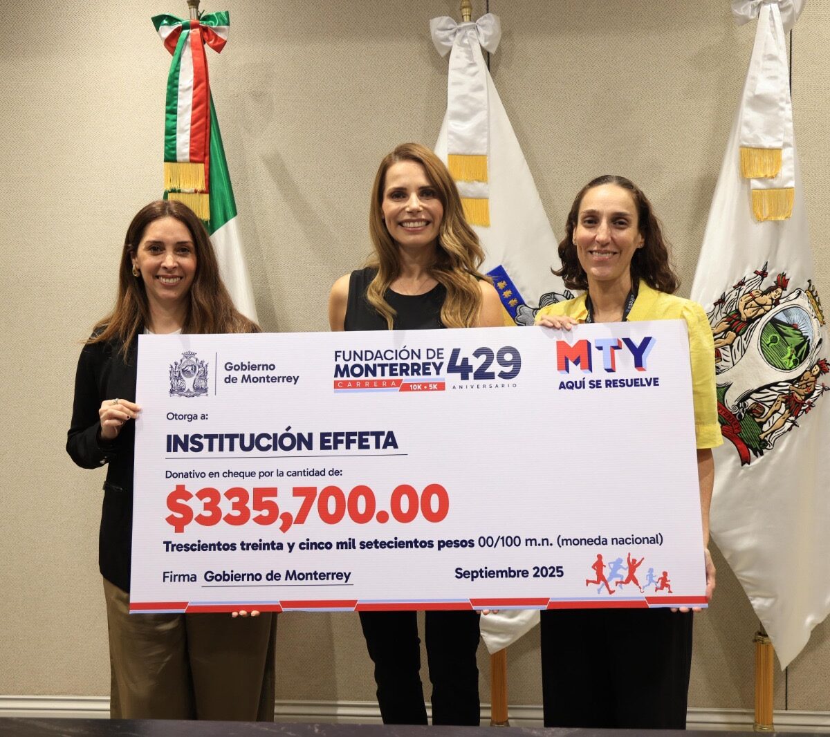 El donativo, por un monto económico de 335 mil 700 pesos, es el resultado de la inscripción de los participantes en la carrera atlética celebrada en el marco del 429 aniversario de Monterrey, en la que se registraron más de dos mil 500 corredores.