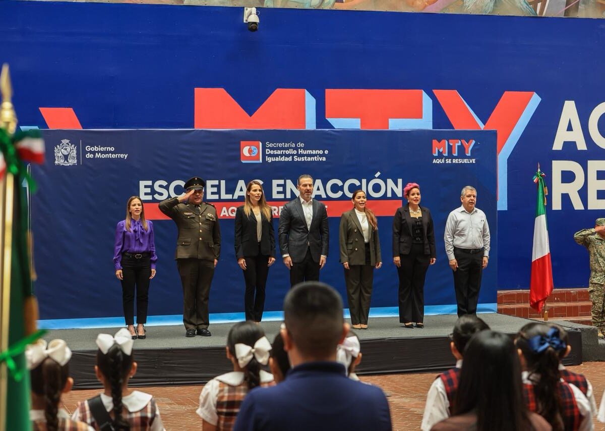 Al abanderamiento acudieron Gaby Oyervides, presidenta DIF Monterrey; Karina Barrón Perales, secretaria de Desarrollo Humano e Igualdad Sustantiva; Ana Villalpando, directora de Educación municipal; Teniente Coronel de Infantería Ubaldo Jiménez, representante de la Séptima Zona Militar; y Juan José Gutiérrez, secretario general de la Sección 50 del SNTE.